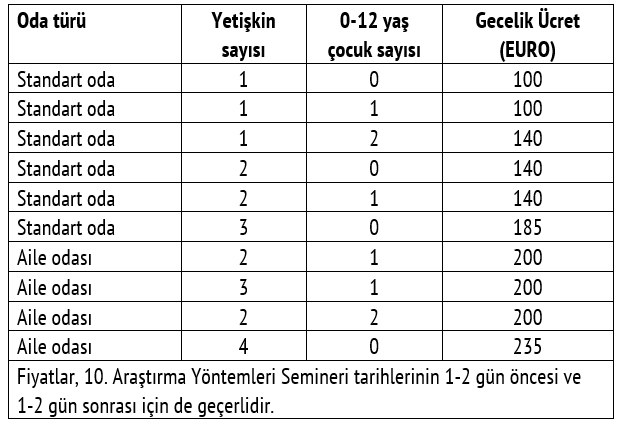* Konaklamasını otelde yapmayacak katılımcılar arzu ederlerse bu ücret karşılığında seminerin günlük başlangıç ve bitiş saatleri arasında (09.00-18.00);